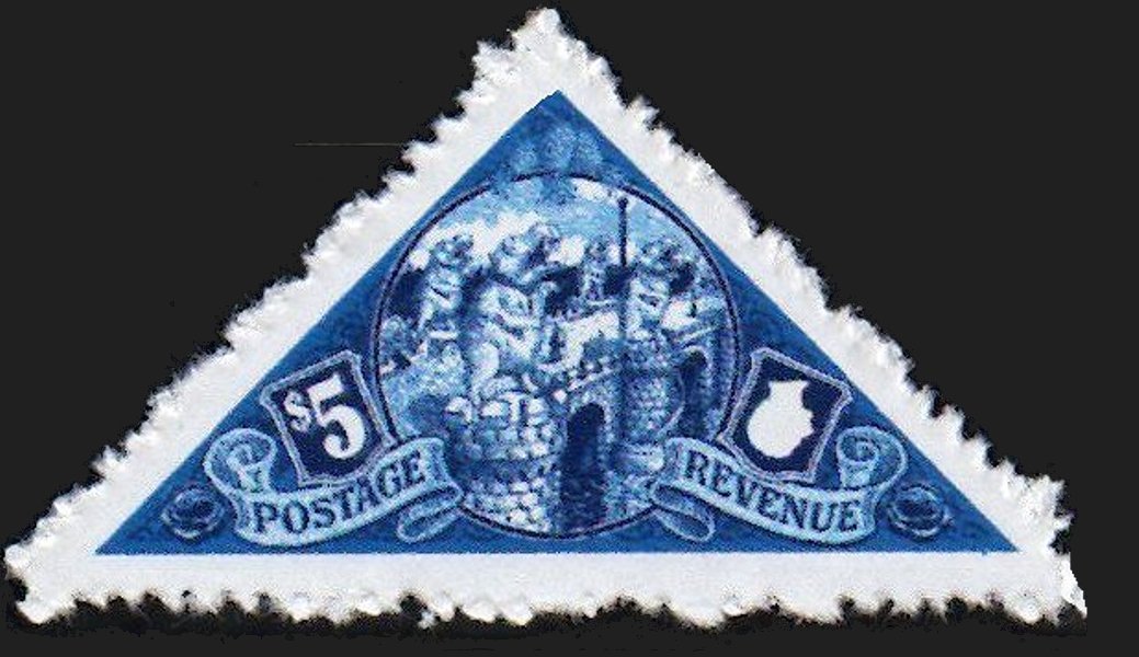 Advert for Mr Harry King from the margins of the Merchants The $5 Brass Bridge blue triangle Sport with inverted Patrician`s head Guild Morporkia sheet This example is one of the very few with Bath perforations This stamp will always remain the holy grail of Discworld stamp collectors