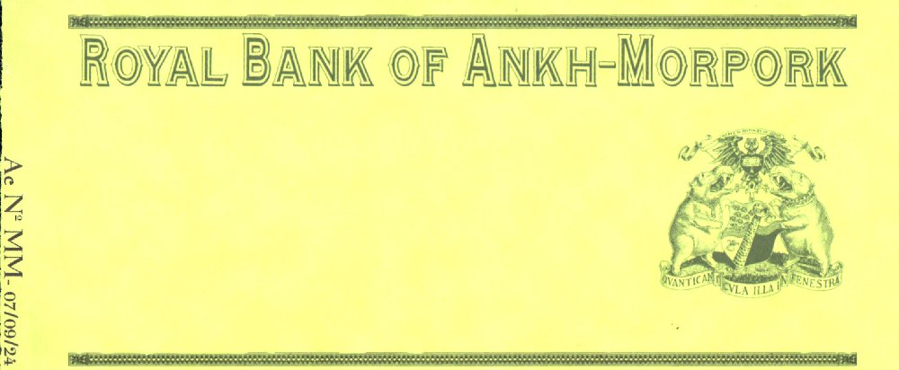 One of Moist`s first experimental $1 bank notes and the Royal Bank of Ankh-Morpork chequebook signed b y Mr Fusspot. The cheque book was only available with Waterstones first editions of the book