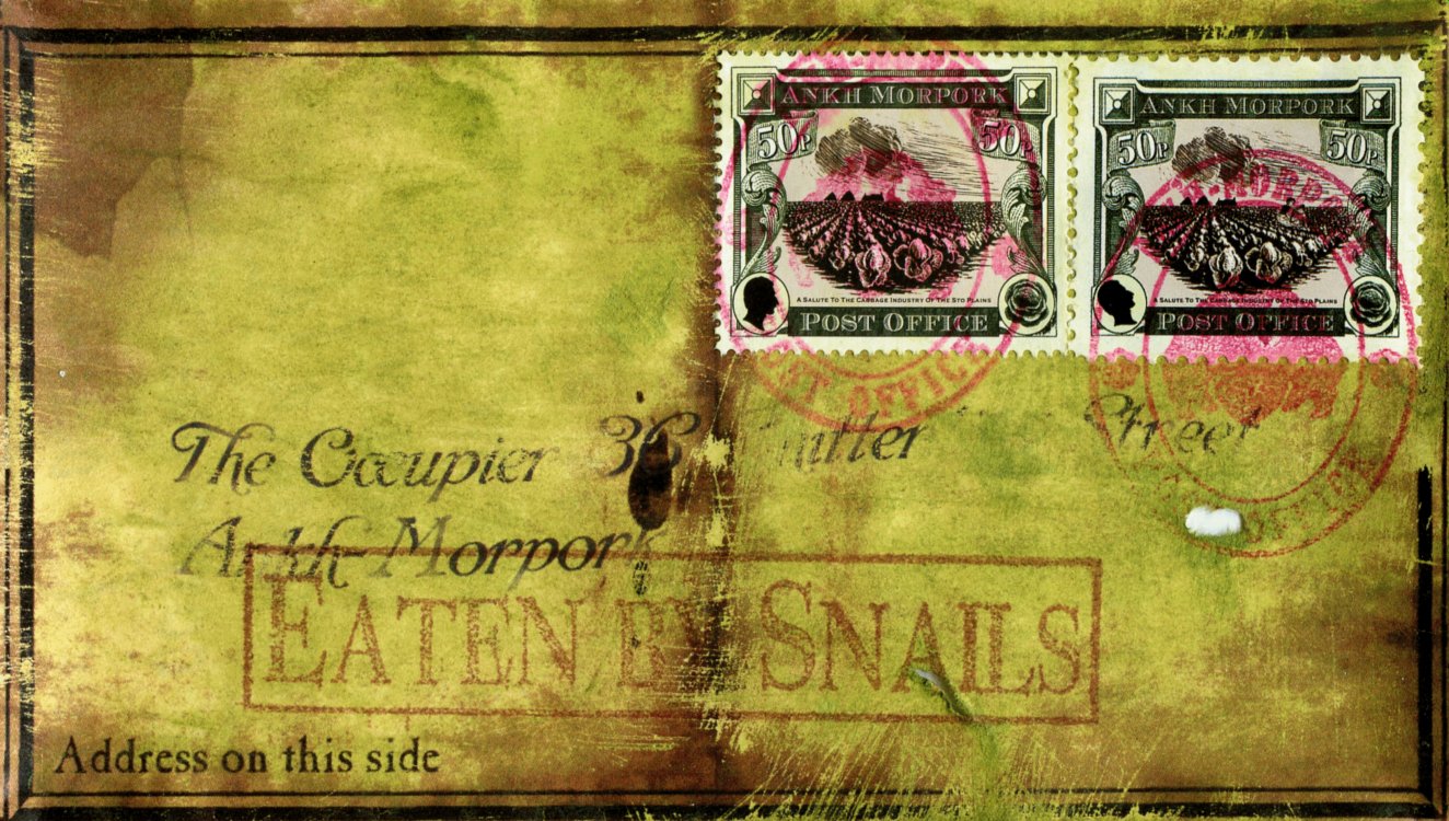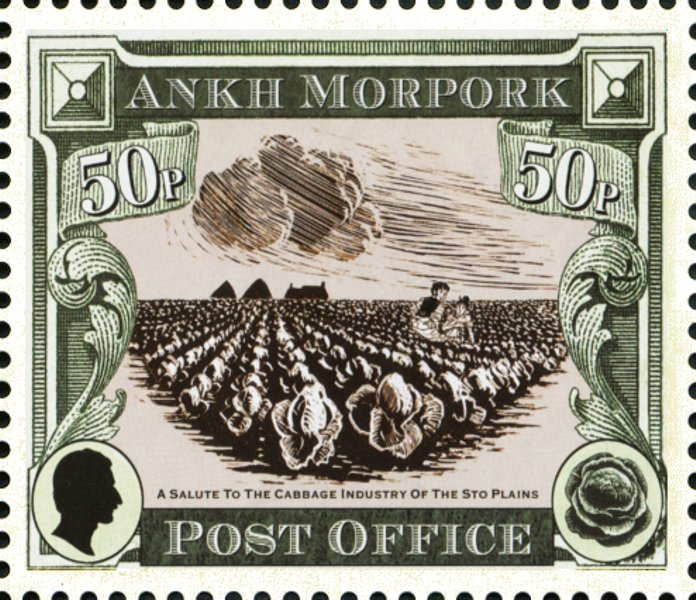 Moist starts to attempt an explanation for both the cabbage scented glue on some of the 50 pence stamps, and a courting couple that can be seen in the cabbage fields on other copies of the same stamp. Vetinari dismisses any offence caused as being self inflicted as a magnifier was needed to be used to see them clearly.