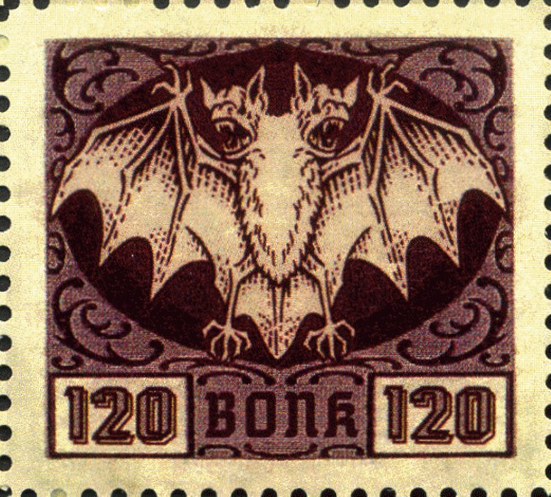 Fina lly the train arrives at Ohulan Cutash, a frequent stopover town for those traveling from Ube rwald and beyond down to the towns and cities of the plains. Thus here is yet another meeting place for different cultures. You can catch a slow boat back down the River Ankh if you prefer and have time on your hands.Lancre is not far away, while dwarfs from the Ramtops venture here. Once the Ankh River just beyond the town is bridged the rails will extend to Bonk, and perhaps even further, though it is rumoured that bandits still lurk in the foothills. The trains need still to carry Watchmen when traveling this far from the relative civilisation of Ankh-Morpork The 120 Bizot stamp from Bonk showing the doubled headed bat. It was released during the Year of the Reversed Ptarmigan.. The Ohulan Cutash 1 Crown