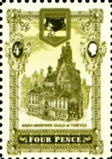 The Fourpenny Horizontal issued by the Guild of Seamstresses features a painting that may well have hung in the Royal Art Gallery