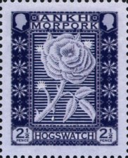 The Wintersmith tries to attract Tiffany`s attention. First there is a snow storm, and Tiffany finds that they are all Tiffany snowfla kes. He leaves her a bouquet of Ice Roses.There are reports from mariners of Tiffany shaped icebergs too. The Wintersmith decides he must become human in order to woo Tiffany. He hears a children`s rhyme about what makes a man; the individual elements, and sets off to collect that amount of each. Where he fails is in the last three lines. Strength enough to build a home, Time enough to hold a child , Love enough to break a heart. He fails to understand these In The chalk it is becoming a very hard winter with massive snowfalls. Roads are impassable and sheep are dying.. For Hogswatch in the Year of the Signifying Frog the AMPO issued a pair of stamps. The Tuppence halfpenny shows one of the ice roses, and the five pence the urchin`s snowman