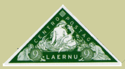 Many of you will be fam iliar with the Cape of Good Triangulars; stamps issued in the 1850s by the British colony at the southern tip of Africa. Laernu has its own version of this design format featuring a more scantily clad young lady with a rather cute little dragon. She is the mythological ‘Mother’ of all living creatures, which start off as dragons which have the ability to fly, swim or run. She visits each dragon and asks what creature it would like to become. Indecision results in them being reborn as humans. These stamps may be the key to the world of Laernu.