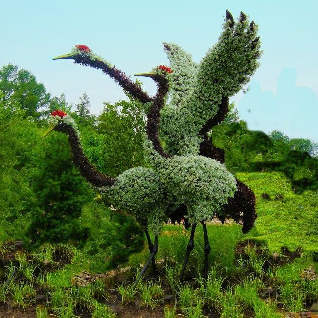 The earliest communities of Mμ are known as the Hedge People because of their skills in constructing both homes and primitive temples from plantings of yew and privet. Excavations in the central plain of the Land of Mμ by archaeologists from the Mμniversity of Mμ have revealed roundhouse type constructions with central hearths surrounded by a circle of closely planted privets. They were also responsible for Hedge Henge. No visible remains exist of this temple, but geo-imaging has revealed concentric plantings of sturdy yews within a circular ditch and mound. One theory was that they were trimmed into a maze design, with the central area only accessible to the priests. Aligned to the rising sun on the longest day, it is also believed that the priests used the Henge on a daily basis to organise the populace. When the morning sun started to appear over the top of the hedge it was time to get out of bed, whilst when the sun was totally obscured it would be time to retire. Work on it is believed to have started nearly 4,500 years ago and it remained in use for at least 1,000 years. Quite how they managed to keep the hedges neatly trimmed without metal tools is the subject of much debate. More so in the case of their topiaries. Scratched pictures on cave walls show what can only be topiary works of hoopoes, peacocks, hyaenas, bears and pigs. These may have been planted in an long avenue leading up to Hedge Henge. On the right is a modern day reconstruction of one of the topiaries which seem to represent Emμs