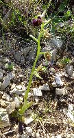 April 13th  A coach trip with limited stops is not the best way to spot orchids, but the tortuous nature of the roads meant that there were frequent sightings of some species recognizable from the windows. Following the P53 coast road from Vieste to Mattera, in the vicinity above Pugnochiusa there was Barlia robertsonia (recognisable from the large size and maturing seed heads in April), Orchis italica and probably Anacamptis pyramidalis (both recognised by the form, size and flower colour). We stopped a while in Monte Sant'Angelo and on a bit of waste ground near the coach park we found colonies of Ophrys - possibly two species (pictured via a back-up camera due to flat batteries). The first seems to closely match the second unidentified Ophrys species seen at site 4 above. Leaving the town we took the P528 to cross Gargano as directly as possible to Peschici. Soon after the town, and in meadows for the first few miles large colonies of what were most likely Anacamptis morio (from the size form and colour) were seen. And on the outskirts of Pescici were more B. robertsonia. Travelling along the S89 back to Vieste, and about 4 miles from the coast there was an obvious colony of Orchis (Acereas) anthropophora.