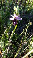 Site 2. This spot, at 2,100 foot, was even more promising by a small holding and deserted farmhouse, with underlying rock exposed. Three species were found represented by just three plants, not all Ophrys, and they were spread over a wider area. The first find was another Ophrys species.  Taking into account the white sepals with a greenish centre line, the pink petals, and the unusual speculum marking on the labellum, the best candidate for this is O. biscutella, Delforge stating that it grows on Gargano and elsewhere up to 4000 feet. It grew within the exposed rocks pictured in the location photo.