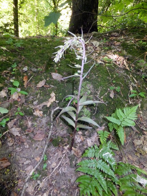 As I am passing nearby again, I have time to pop in and see if the Coalbrookdale Violet Helleborines are in flower yet. Yes they are. Not in full bloom but good enough. The tall plant in the woods is particularly impressive