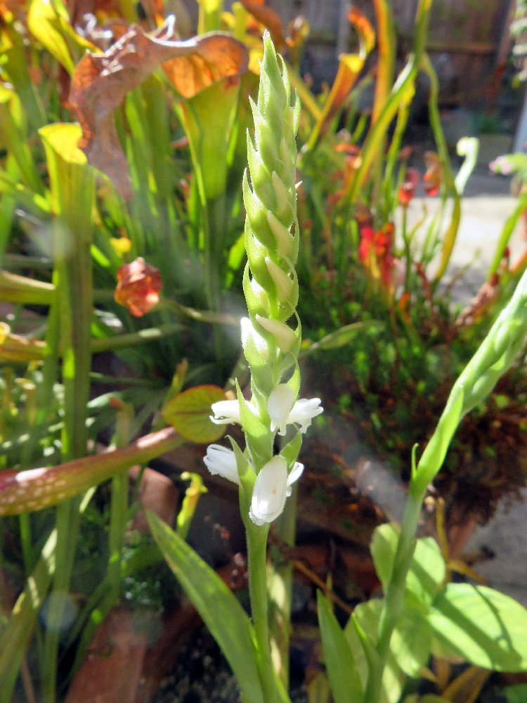 My Spiranthes odoratisima have flowered. Those plants behind are part of my Sarracenia collection