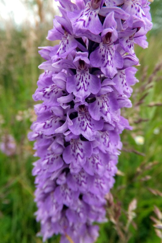 We start following the path from the carpark past the visitor centre and almost immediately there is an un-mown bank with Southern Marsh Orchids, showing some degree of variation. Go carry on, over the bridge, along the bank of River Croal and come to the Nob End reserve. In the more open area are more Southern March and Northern Marsh Orchids. There is quite a range of variations in some specimens, and as the site is noted for its hybrids I am probably not too mistaken if I take it that some with characteristics of two species are indeed hybrids. These seem to show a some of the Southerns with either Northern or Early Marsh Orchid, though the only true one of these seen was var coccinea, which has a deep red colour and today was nowhere near flowering. There could be some intermixture with the Common Spotted Orchids, but this is less likely. The was also what looks like a Leopard Marsh Orchid, D. praetissima var junialis. It has at least one leaf with hollow round large dark spots with dark bars on other leaves. The flowers also resemble the SMO, but the labellum has bold unbroken crimson lines. Both these are features of the Leopard. Of course it could be a Southern Marsh x Common Spotted hybrid (and that's the opinion of others who are more knowledgeable than me), but that's still worth a mention. Halfway around and the heavens open. It doesn't last long but now the vegetation is all wet and feet and trousers are well soaked. There is no sign of the Fragrant Orchid nor the Marsh Helleborines, but these are later flowering and those who know reckon everything is two weeks late this year anyway.