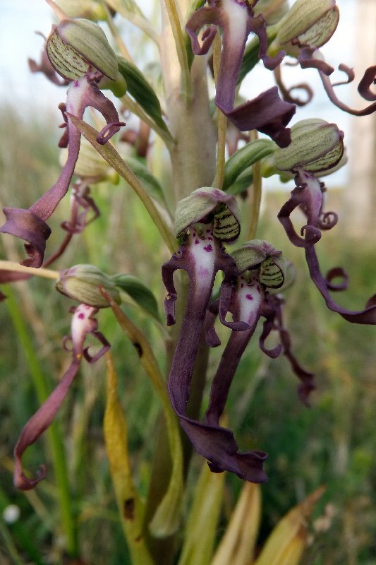 This is a well known site for the Lizard Orchid with perhaps thousands of them across the Royal St Georges golf course and just about anywhere nearby. Access from Sandwich itself is by a toll road, but if you park at the Bird Observatory they let you in for just œ1. Go after 6pm and the tool booth is unmanned and you can drive down to the beach road, turn right and park a few hundred yards down the road Immediately I can see the Lizard Orchids, both within the golf course and on the dune-like bit between the road and the pebble beach. I have been warned that the cold spring of 2013 was delaying the flowing period of most flowers by a couple of weeks, and had contacted the observatory a few days earlier and they were doubtful that any would be in flower. I wasn't going to let this deter me though, as this was perhaps the one chance for a while to see any - flowering or not. While most were still in bud, it wasn't too long before some in partial and full flower are found. Both pale and more heavily marked examples can be seen. The only disappointment was that they weren't as tall as I had hoped. They grow both on the links, accessed via the public footpath, and the sandy bank between the beach and the road. Another rarity that was common there was the Clove-Scented Broomrape, Yes it does small of cloves.