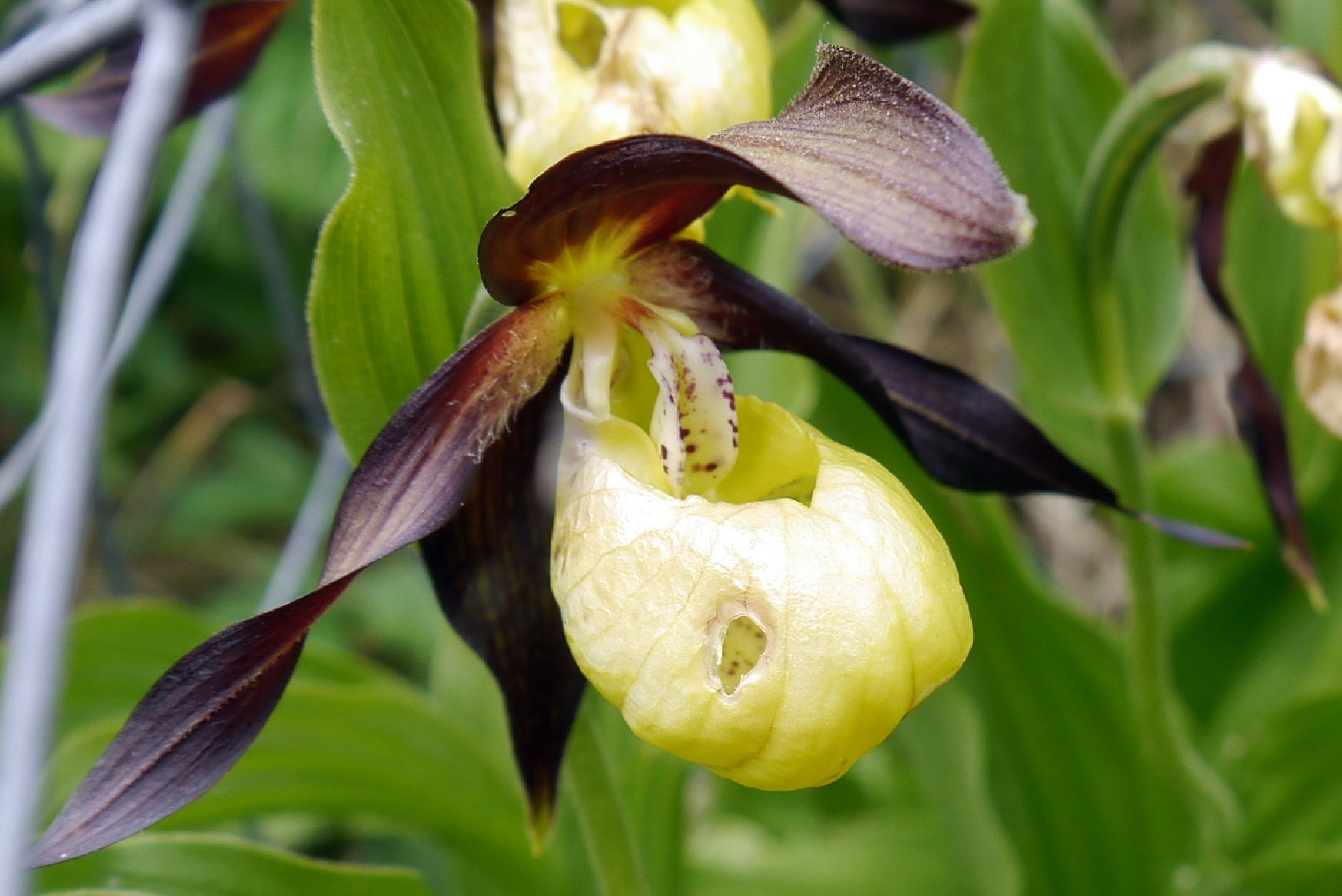 A trip to All Creatures Great and Small country and a few places to visit. First off is Kilnsey Park which is primarily a trout farm, with angling lakes, kids activities and for me, most importantly, a little nature area with orchids. Here are some Lady Slipper Orchids in a pair of cages. There are largely finished now, but I persevere and get some shots of some flowers without the wire over the flowers. These are from seeds of the last native British specimen which grows nearby at a secret location (though it is not too difficult to narrow down the likely spots). Those at Gait Barrow were from European stock as was the one said to be on a Lancashire golf couse. However, is there that much difference? To me no, but seeing as these are going to be better looked after what does it matter. Very showy.