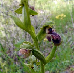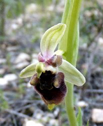 About 1 km before the road junction in the village of Prodromi near the north coast I noticed something very orchidy growing on the road verge, We stopped and found several different orchids. There was a 3 metre steep bank up to a citrus grove and on top of this there were a few Ophrys sicula ssp. galilaea. No photos of these because of thie position and other vegetation. What I had spotted though was Barlia robertsiana. At nearly 50cm tall it is not surprising that I spotted it in passing. The flowers were an interesting greenish-violet colour. The altitude here was 32 metres, so it is surprising that this was still in flower. Being one of the very earliest flowering orchids, Barlia would be expected to to be over in such lowland sites. Also on the verge was another species that had gone to seed. From the early flowering and the `twist' to the flowers around the stem it is most likely these were Orchis collina. On the bank itself were some Ophrys. Some of these appear to be Ophrys flavomarginata while a couple seem to be Ophrys attica. The picture of this below is almost a match for that illustrated in Delforge. The shoulders o the lips for these two seem quite different as does lip shape.