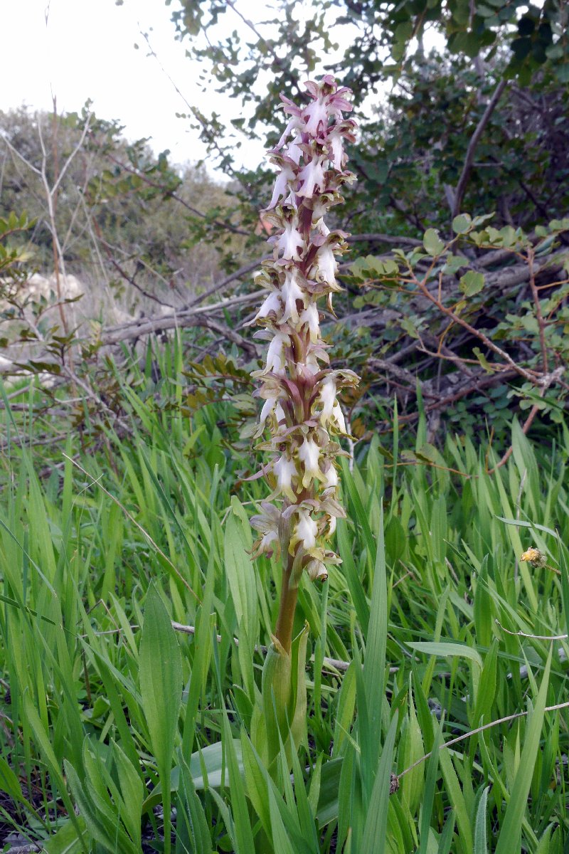We missed this spot of the way to Smygies, because it just didn't look like I expected from other reports, but called in on the way back. I am still not sure we searched for orchids where others had been, but a patch of waste ground which approximated to the directions we had yielded some orchids. Sadly though, Orchis punctulata was not one of them. We were told later that this had been in flower in Neo chorio a week earlier, but the two flower spikes were hidden under the shrubs. So just five species and nothing new seen. The most obvious orchids were a small group of 50+ cm Barlia robertsiana, in a pale pinkish colour. hidden in the longer grass were both Ophrys umbelicata and flavomarginata. The later was going over to an extent compared to Smygies, unsurprising as this site at at 90 metres altitude is 160 metres lower. Also present was Ophrys sicula ssp. galilaea again, with one plant having the dark markings on the tip of the lip reduced to what looked like a comic moustache. The other orchid seen was an Orchis species, well past flowering. Again the assumption is that it is Orchis collina, O. fragrans, which also would be past flowering.