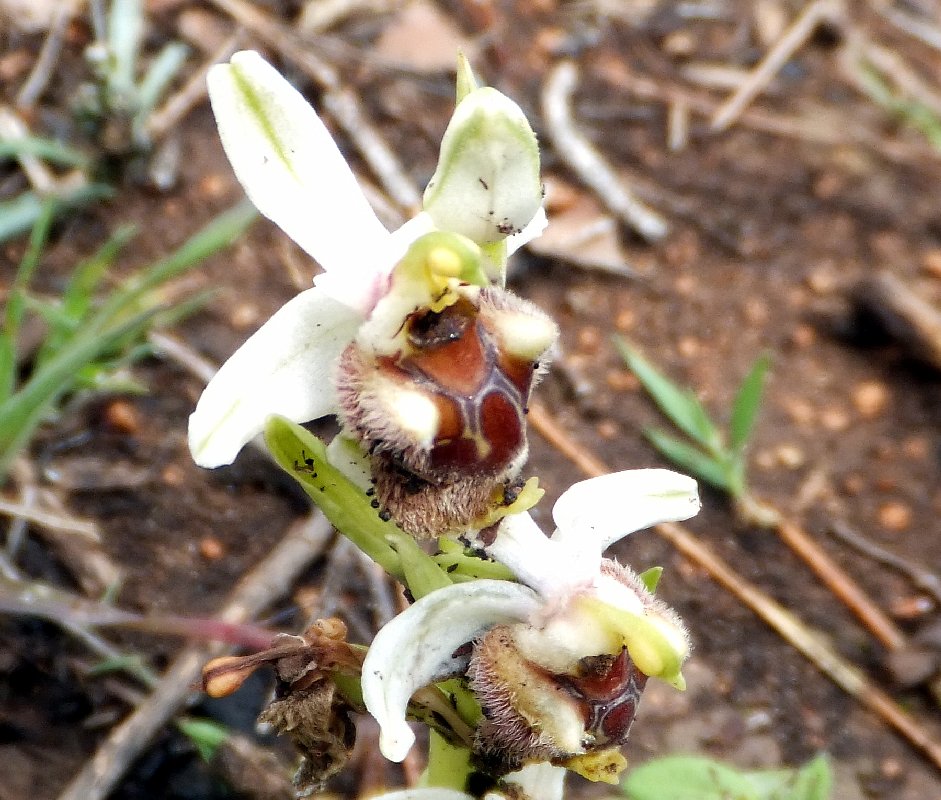 The remaining species have been harder to identify, or at least separate from each other. The fact that no species has a consistent lip marking makes identification harder. These species have white sepals with green patterning, and three sepal shapes can be seen; lanceolate with pointed ends, oval with rounded ends and virtually circular. All have very small, hard to spot petals. The lateral bumps on the lip also vary somewhat. Those with lanceolate sepals and rounded bumps I believe to be Ophrys levantina while those with more oval sepals and more pointed bumps Ophrys bornmuelleri. O. levantina is said to flower earlier and this does seem to be born out with the lower flowers on the spikes going over. The other round sepaled species is a bit of a mystery, but is probably a form of the O. levantina.