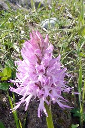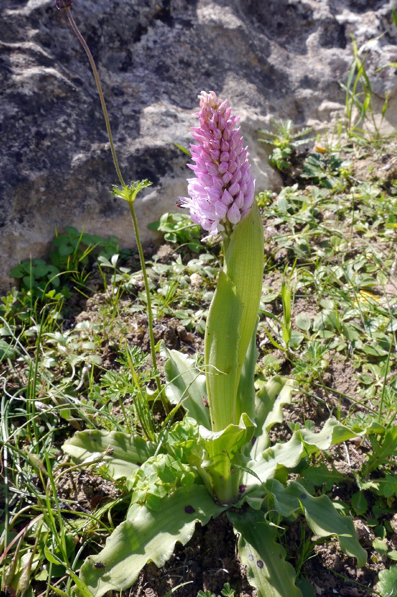 The fire damaged area was quite extensive and recent, but seems not to have affected the Giant Orchid, Barlia robertsiana. Some of these were coming up in areas of bare earth. But there were more examples on the limestone terrace side, with pink colours and a sort of washed-out olive colour to the petals and sepals. Another discovery was an Orchis species in bud on the wooded side. The pink flower buds and the wavy edges leaves meant Orchis italica, proved across the road where most were looking magnificent in full flower.