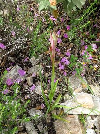 Having picked up a hire car we set off on Ian Phillips’ route 1 in Orchids of Malaga, and had no success at the first sites mentioned. This is not going well. A couple of hours wasted. Pulled off this minor road to see exactly where we were on the maps and found we were at what was once going to be a housing development but had been abandoned. If I cannot find orchids from the book, why not look here? There were a couple of Serapsias parviflora and a few more Orchid coriophora, but only one of the latter had an open flower.