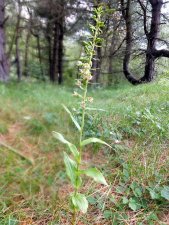 I feel this is worth a return journey having missed it last year. I am still wondering about Green-flowered Helleborines, and the Dune Helleborines are always a delight; to me at least. The latter are well represented; I gave up counting at 150, and that was just those seen as we made our way through the fringes of the woodland in an anti-clockwise direction. The only things worth reporting were that some were heavily infested with aphids, while there were a couple of plants with rather dense inflorescences - would these be a dry weather effect? The Green-flowered helleborines seem to be var pendula, with very white flowers and very droopy before they open. There are no indications of fertilisation before the flowers opening. One plant had a single double flower, whith douvle each sepal, petal and column, and single ovary. One oddity is a single Broad-leaved Helleborine growing in the woods, close to both of the other species. It has quite colourful flowers, but a lot of aphids. There no others of the species around, but the clear presence of a viscidium on one newly opened flower seals its identity. Even so, there is something a little odd about this plant. Noted for the first time were Pyramidal Orchids on the margin between dunes and tress, and Common Twayblades within the woodland.