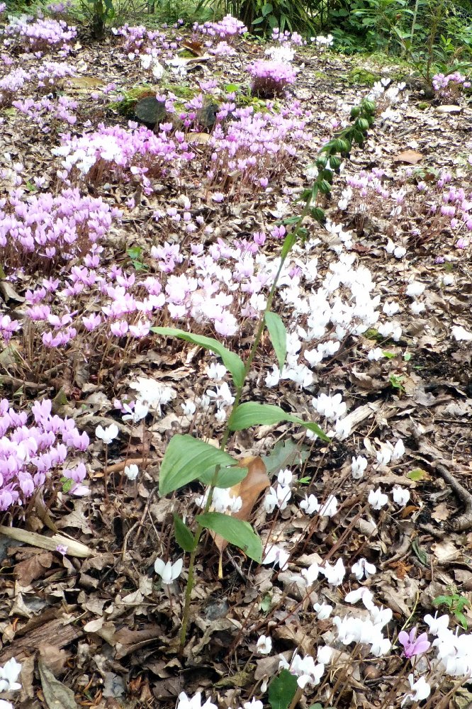 Another gardens and another Broad-leaved Helleborine spotting. This time it is slap bang in the middle of a bed of cyclamen, and almost certain not weeded out by the ground staff. A look around the immediate area, especially at the back of the flower bed, put the total count to a round dozen. They all showed swelling seed pods. Each time this species has been found in gardens (here, Hare Hill, Eaton Hall, Bodnant) they have been growing in beds where they will not be disturbed; not in the `woodland walks'.