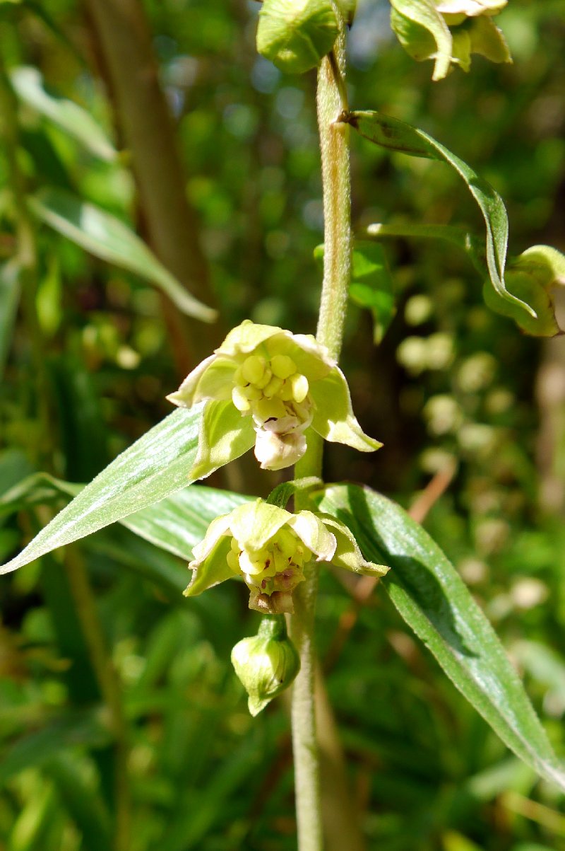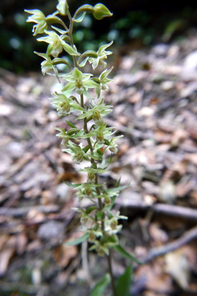 Theree is a repeat of a phenomenon I have noticed here before. A number of plants not only have quite pendulous flowers, but also seem to show swelling of the ovaries very early in the flowering period. I am NOT tempted to suggest these may represent a hybrid with Green-flowered Helleborine, even though this has been questioned previously from online photos. Yes. GFH do grow not far away, but the chance of this happening is so remote it must be considered improbable. However, perhaps there is tendency for some plants in this colony to auto-pollinate.