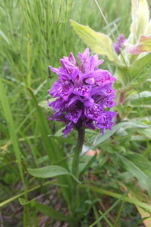 The orchids have put on a good show as usual, though first impression is that there was quite as many this year. The verges have had a mow some time ago but the rest seems to have longer grass. The common itself seems to have had a number of vehicles driven over it from the number of ruts; probably last year or 2011. This year though I will stick my head out and decide what I think is growing. There seems to be two main populations mixed together; Common Spotted Orchids and Dactylorhiza x venusta, the hybrid of the Common Spotted and the Northern Marsh Orchid, while there is a small and possibly dwindling population of the latter parent; this year those plants representing these looked like they had finished flowering. As the hybrid is often fertile it seems to have undergone a degree of back crossing with the Common Spotted creating quite a range of colours and patterned flowers.