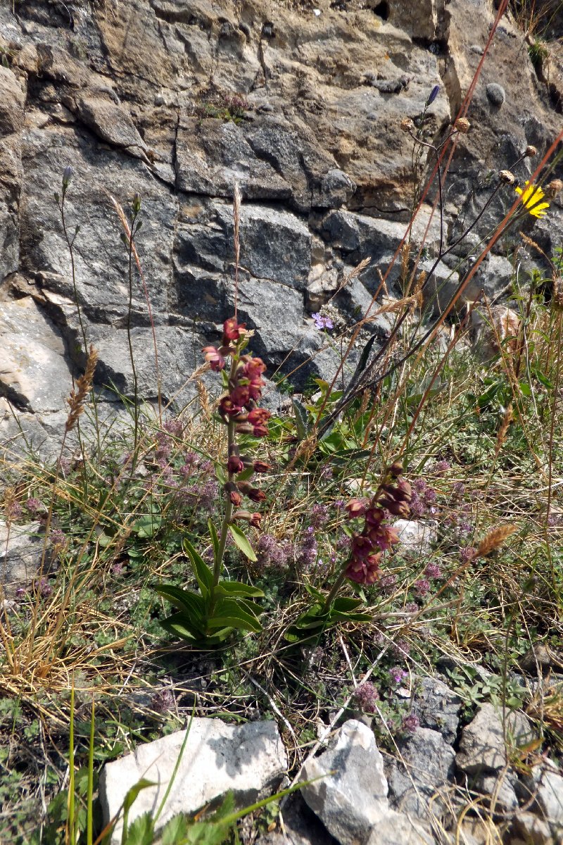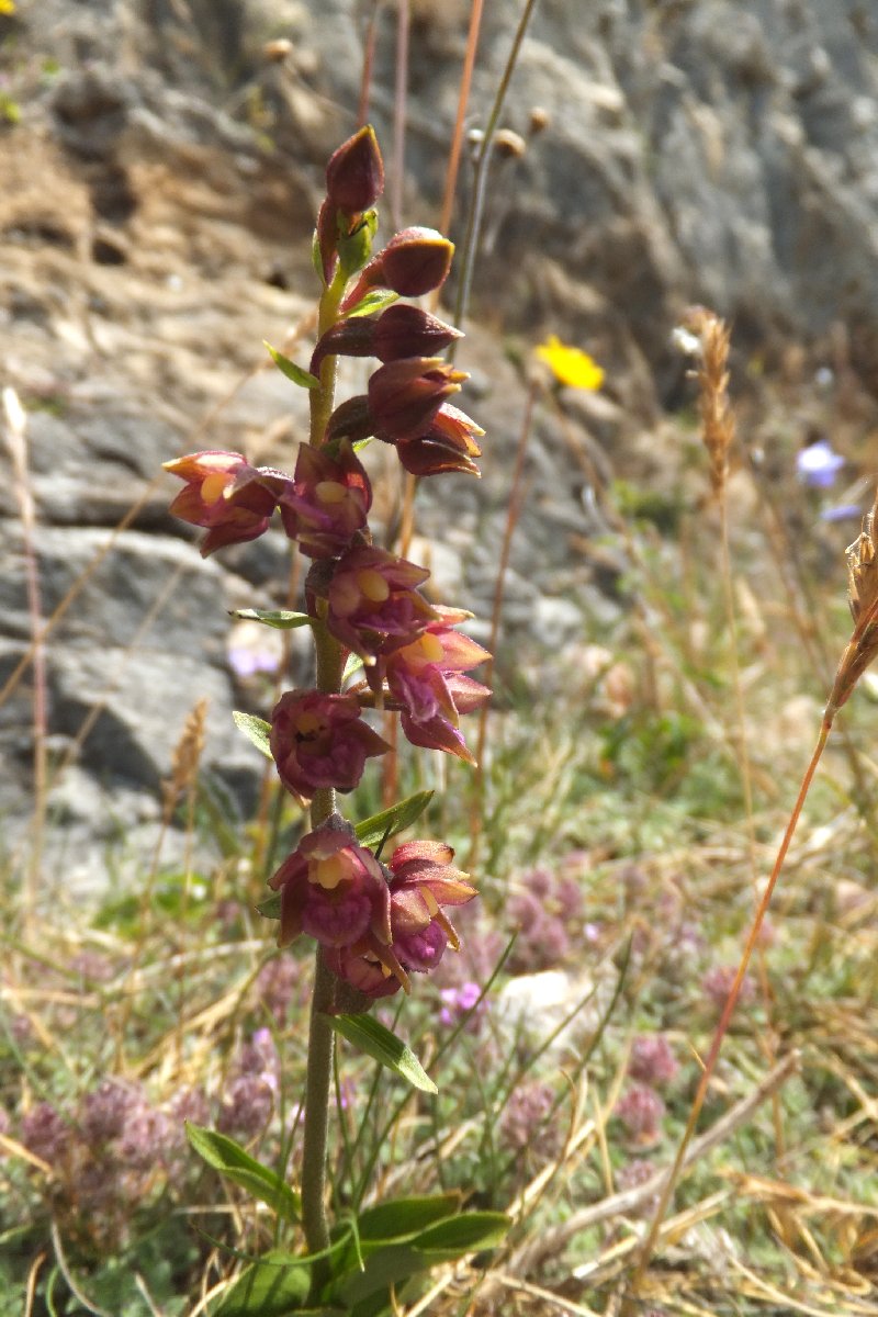 We've been to the Orme many times, and have looked in vain for the Dark Red Helleborine. According the books, especially Wild Orchids in Wales by Sue Parker, it grows in the grykes in the limestone pavement. This geological feature, on Great Orme, is in scattered patches above Marine Drive at the far end of the rock. Several searches there have been void of any orchids, including examination of one 40 foot square patch that is caged presumably to protect plants from rabbit grazing. However following a tip off with more precise location we go around to the far side facing the NW Welsh coast, park the car, and walk down towards West Shore below the crags on the left. And here we find it; in two areas about 100 yards apart. Most are growing at the base of the crags on the margin of the road, but more can be seen growing in the rocks above. In all honesty they would not have been found without the instructions given because they are not as impressive we thought. None were 30+cm tall, and the red colour helped them to blend in rather than highlight them. In all we counted 16 plants in flower. There may be more in the rocks above and hidden from the road, but scaling those rocks would be very tricky. What we notice is that each plant seems to be flowering at different times with some nearly finished and one still in bud, despite growing in the same area. Also they show a degree of colour variation with one plant noticeably paler seemingly lacked most red colouration.