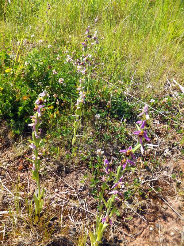 A trip to a second RSPB site within a couple of weeks, this time hoping to see the Northern Marsh x Southern Marsh hybrids reported to be there; especially as these are said to be uncommon with not only their geographical separation, but also because they are not that closely related within the Dactylorhiza complex. Straight off though, it was the Bee Orchids south of the reception that made the day. Over 130 counted and some were well established plants growing up to 46cm with 11 flowers. Perhaps a week too late to see them at their best, but still impressive. A couple of slightly atypicals were seen. One showed a vertical yellow line running the entire length of the lip, and looking like it was the two halves of two different flowers joined together. The other had near circular lateral sepals. A thought came to me looking at the site on a map. This reserve lies directly east of Freeman's Copse, another Bee Orchid site. Could that have been seeded by westerly winds blowing from here?
