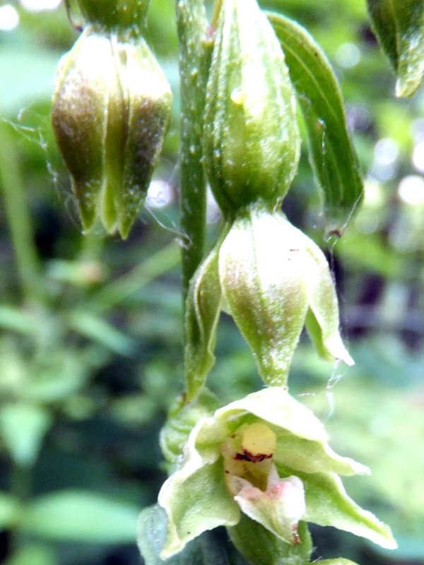 The Broad-leaved Helleborines are just a bit later flowering than the two other sites visited today. There are only a few flowers actually open, and it is rather difficult to spot them while still in bud. This make the numbers look less than in other years, but this will probably prove to be deceptive. One shot shows an enterprising spider has built a web around a newly opened flower and has already caught a number of small flying insects that may have been attracted to the flowers.