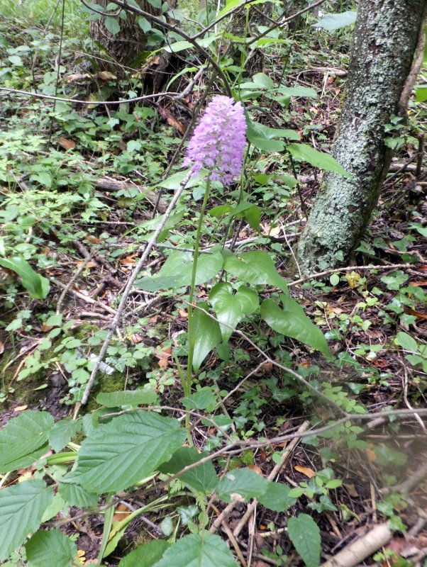 I popped in here in passing as it lay between the two other orchid sites being visited the same day. I didn't expect to find anything new, but it would only take a few minutes. The first thing that struck me was the number of Pyramidal Orchids and their size. Growing, unusually for them, out of direct sun they were very leggy and a number had fallen over due to their height. There was one specimen, just by the track with an extremely large flower spike growing to 62cm. They were also very pale; a sort of pale lilac colour, rather their normal vivid pink - almost washed out. This must be the effect of low light levels on this normally sun-loving plant. Surprisingly there was also one late flowering Greater Butterfly Orchid at the end of its period; the rest had all finished.