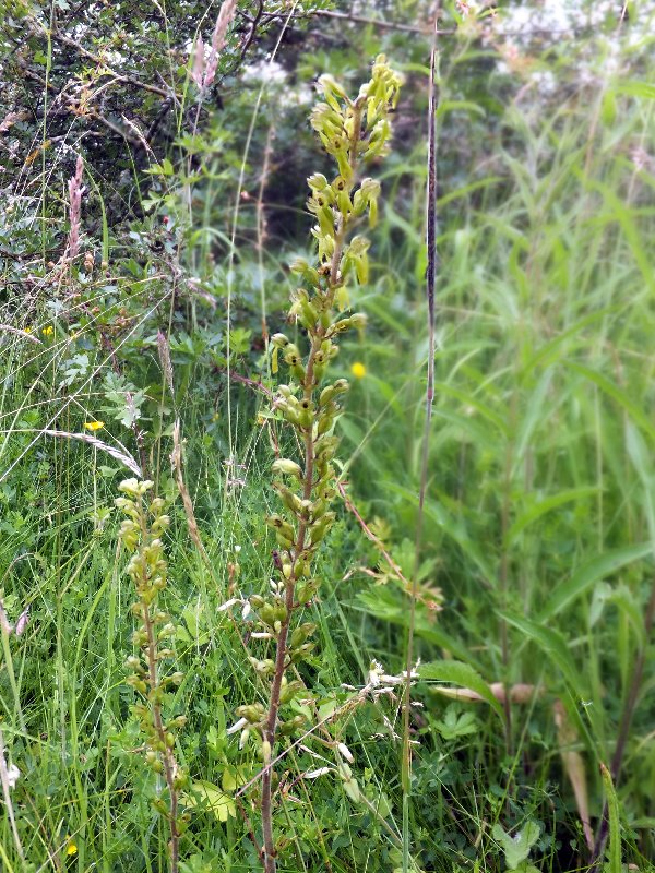 A clearing in front of a copse revealed two more species which provided a bit of a conundrum. There were late flowering Bee Orchids and early flowering Dune Helleborines. The books will tell you there is no overlap between the flowering of these two species. It is only a couple of Dune Helleborines actually in flower; most will need at least a couple more weeks. Some show an unusual yellowish colouration of the flower stem and ovary, which I have not seen before. Quite a number of these were also found along a path that passed through more woodland. On one flower is a gnat, one of which must have bitten my hand, causing an allergic reaction resulting in my entire hand and fingers to swell up, itch like mad and ache!