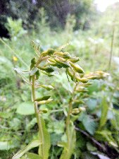 Across the R. Sychnant by the wooden bridge is a previously unexplored area. It's more of the same plus a couple of others of note. There are a pair of Dactylorhizas, the only two marsh orchids we see today. They probably have D. purpurella sap in their veins but also have spotted leaves. Neither is very tall. And there is a oddity - I do spot another similar plant later - which seems to be a `failed' flower; a pale Common Spotted Orchid like one seen at Eryrys. Neither is in flower and perhaps neither will open properly. They have that look to them.