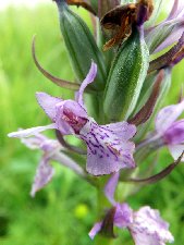 There are also two further sub-populations which resemble the var cambrensis at Eryrys a few days ago. There is a mildly spotted leaf type. It has flowers with a trilobed lip, light coloured with bright purple loops and lines. And there is a second type with unmarked leaves and similar flowers, though the markings are more dots and dashes. The latter have just started to set seed so must flower a few days earlier. I can only conclude that if they are not D. purpurella cambrensis and D. x venusta they are both part of the same population. The spotted leaf plants seem to have slightly paler flower colour providing greater contrast with the lip markings, but none of the photos show if the bracts are spotted (as described for var cambrensis). Finally we see some Common Spotted Orchids. They are not numerous, and it is hard to see how they could make a big contribution to any hybrids. That said they do grow with the Northern Marsh and other similar orchids.
