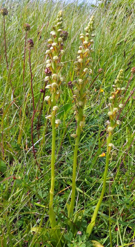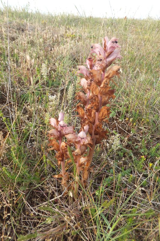 This is a well known site for the Lizard Orchid with perhaps thousands of them across the Royal St Georges golf course and just about anywhere nearby. Access from Sandwich itself is by a toll road, but if you park at the Bird Observatory they let you in for just œ1. Go after 6pm and the tool booth is unmanned and you can drive down to the beach road, turn right and park a few hundred yards down the road Immediately I can see the Lizard Orchids, both within the golf course and on the dune-like bit between the road and the pebble beach. I have been warned that the cold spring of 2013 was delaying the flowing period of most flowers by a couple of weeks, and had contacted the observatory a few days earlier and they were doubtful that any would be in flower. I wasn't going to let this deter me though, as this was perhaps the one chance for a while to see any - flowering or not. While most were still in bud, it wasn't too long before some in partial and full flower are found. Both pale and more heavily marked examples can be seen. The only disappointment was that they weren't as tall as I had hoped. They grow both on the links, accessed via the public footpath, and the sandy bank between the beach and the road. Another rarity that was common there was the Clove-Scented Broomrape, Yes it does small of cloves.