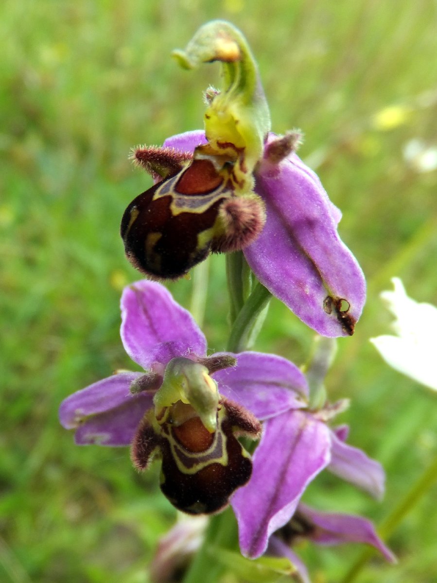 Our third visit to this small and unlikely site. Sadly, it seems to have been a bit neglected of late, with signs, notice board, and benches vandalised or removed. The Bee Orchids here have never been numerous, but today only three at the southern end of little reserve near the canal were found. None to be seen in the woodland glades where they have been see previously. One plant showed flowers in three stages of the lip unfurling, while another was a clear 14-15 inches tall.