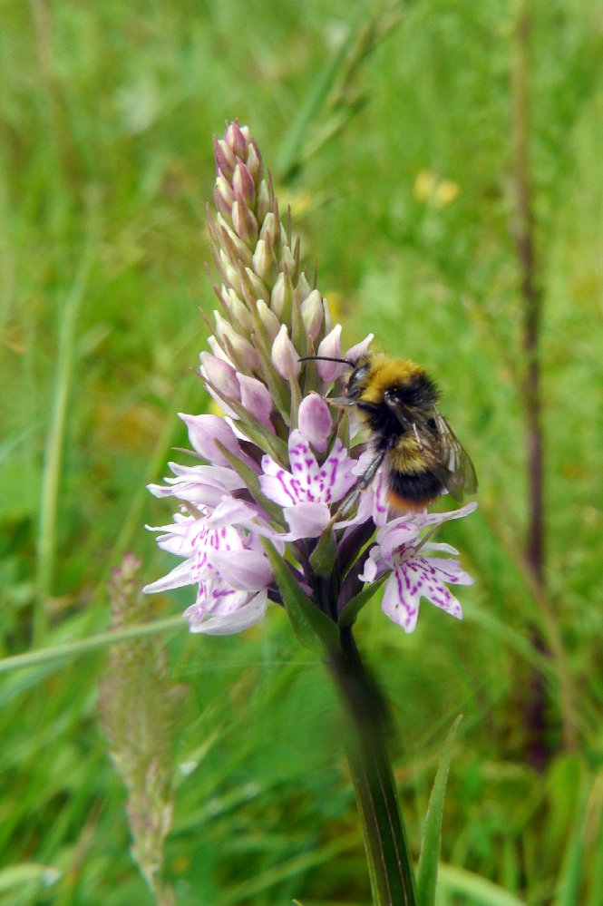 It wasn't difficult to find bees attempting to find nectar on the Dactylorhiza. They would be unsuccessful as the majority of the genus operate by deceit as they offer no rewards. Attracted by colours and patterns the bees visit every flower trying to find food. All instances here seem to feature the female Early Bumble Bee, Bombus pratorum.