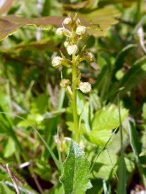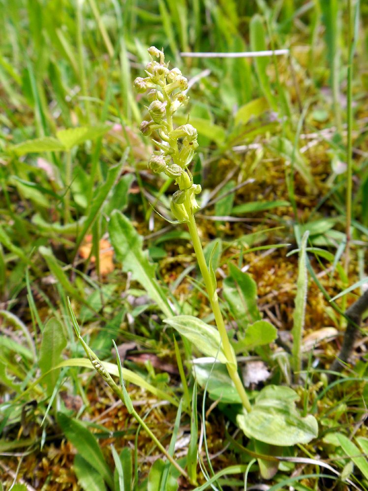Our fist visit of the year here, and eight species (plus a hybrid) seen. Okay, two were nowhere near flowering yet, but that is still quite good. Our primary targets are the Frog Orchids in their usual haunt, and it seems a good year for them with a good number on a bank where I do not recall them in such numbers before. This was spoiled to an extent by someone putting little stick markers by them. This is not going to prevent anybody stepping on them and it ruins the discovery of them for us. Still, we found more than ‘Twiggy’ did!! These early flowering Frog Orchids here are usually unpigmented but a couple this year are showing degrees of reddish colouring, with it highlighting the 180 degree twist of the ovaries.