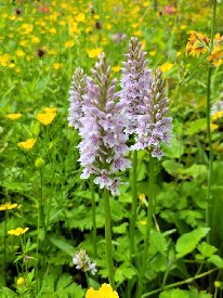 After abortive trips to Wem, Bettisfield and Fenns Mosses, hoping for Heath Spotted Orchids at least or Early Marsh Orchids at best, we stop over in Ellemere, by the mere itself. Across the road on Castle Hill, opposite the Boathouse Restaurant, is a flower meadow with many Common Spotted Orchids. They seem to have seeded themselves in the wild garden of the cottage on the promenade too.