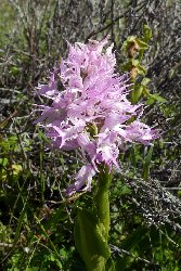 The fire damaged area was quite extensive and recent, but seems not to have affected the Giant Orchid, Barlia robertsiana. Some of these were coming up in areas of bare earth. But there were more examples on the limestone terrace side, with pink colours and a sort of washed-out olive colour to the petals and sepals. Another discovery was an Orchis species in bud on the wooded side. The pink flower buds and the wavy edges leaves meant Orchis italica, proved across the road where most were looking magnificent in full flower.