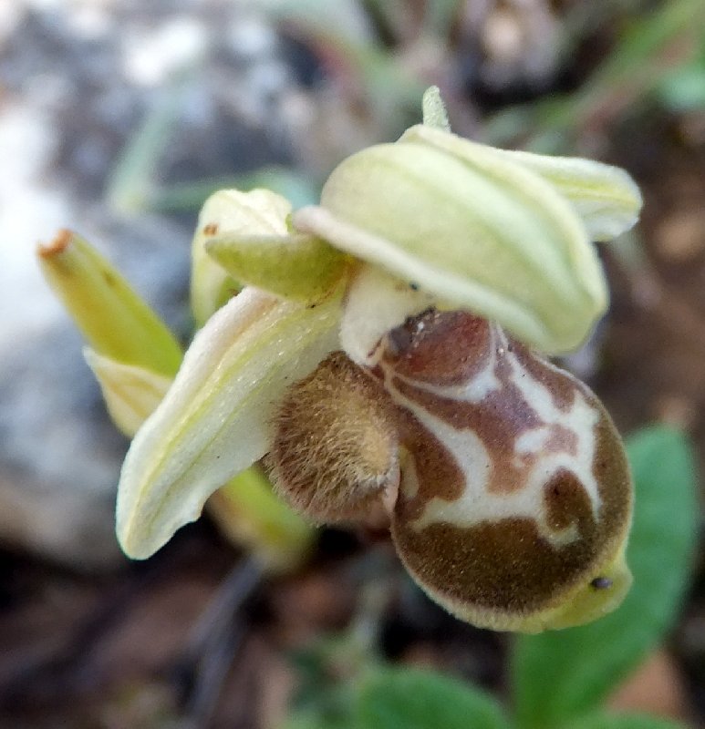 Another couple of miles in a different direction out of the village, and this site provides more variety of habitat. The southern side has both neglected olive grove and fire damaged ground, while across the road are terraces disappearing down into the valley. We only explored the top of this area - it would be so easy to put a foot wrong and that valley was both steep and deep. Shame because there may have been more to see. The altitude is around 185 metres. The first orchids seen were more Orchis syriaca and Ophrys elegans, O. flavomarginata and O. attica; nothing to add to these. But then came orchids from the Ophrys mammosa complex - identified as O. sintenisii and O. transhyrcana, based on the size of the basal swellings and sepal colours. They did seem to grow as discrete populations, the former seen on the olive grove side of the road and the latter on the valley terraces.