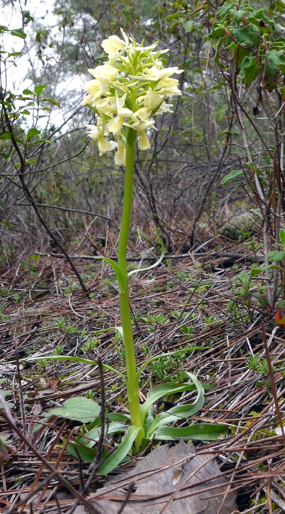 Continuing along the track looking for somewhere to clamber up we came across the lovely yellow Dactylorhiza romana also above us. Getting up there was not easy. It was a bit steep, there had been recent rain, the soil and pine needles slipped beneath the feet, and the pine trees ensured it was cool and dark. No pink forms of this were seen, but it is said only the yellow exists on Cyprus.