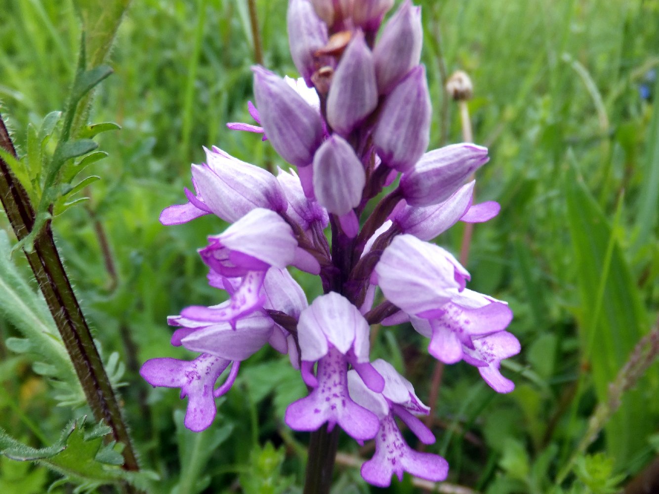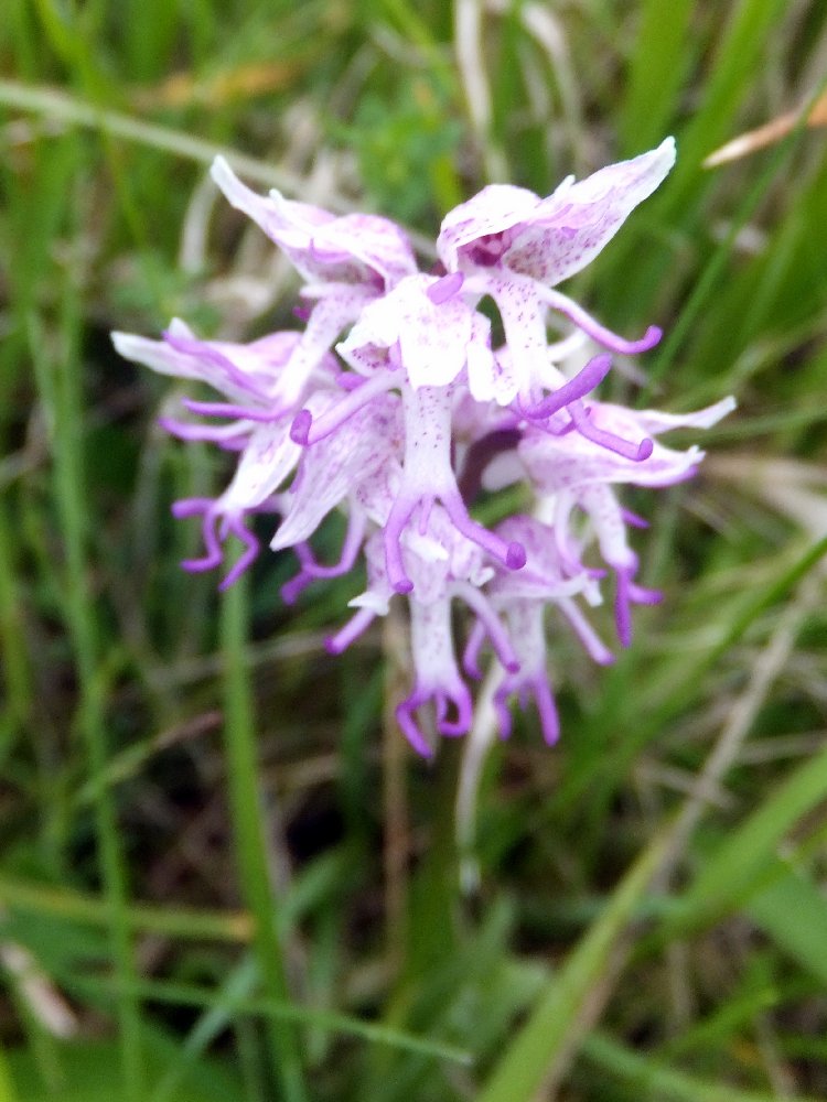 A new place to visit; one that is famous for one particular orchid. The Lady x Monkey Orchid (O. xangusticruris) grows on the appropriately named ‘orchid slope’ and now grows in huge numbers. They are a sight to be seen, even if ropes have been put up to help prevent trampling. This is better for photography than the cages used at Homefield over the Military Orchids as there are more than enough fine examples alongside the walkways. Actually the first orchid to be seen today is a Monkey Orchid, and this was growing on a different slope. The Monkeys are not as numerous as the hybrids but easy enough to spot and even identify from a distance. They seem small, pale and delicate compared to the more vigourous and showy hybrids. There are apparently only two Lady Orchids growing on the site and this year both have had their flowers picked or nibbled away. We don’t stay long enough to have a good look around (we still have to get to Kent after a visit to Silchester Roman Walls), but do find Common Spotteds nearly in flower, and some White Helleborines a day or two off opening properly.