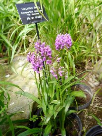Now for a bit of a mystery. The is a small biodome housing a collection of Burren plants including Fly Orchids, Bee Orchids, Pyramidal Orchids and O1kellys Common Spotted Orchid. None of these are in flower (or in leaf for some). Then there are two pots of robust many stemmed Dactylorhiza, with another cluster outside in a border. Clearly the variety Latin name on the label is incorrect, but is it actually an Early Marsh Orchid? Possibly, just, and therefore Var cruenta if representing the Burren species. However, these look like similar plants sold in garden centres as Dactylorhiza majalis, the European broad-leaved Marsh Orchid, or a hybrid that shares some of the same sap. They look vigourous enough, and will let you judge.