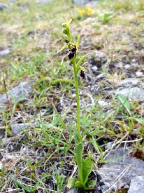 This is just a short distance up the road, and what a difference. It must be that every Burren walking tour either starts here or passes by. Luckily we find a parking space and there, just by the wall, a first orchid. Clearly an Epipactis species. With a flower spike forming now, early in the season, it is tempting to say Dark-red Helleborine, but with a green stem and based on probability it is most likely to be a Broad-leaved Helleborine. If anybody visits here and sees these in flower I would like to know which species it it. There are three more examples close by. Spotting specks of purple in the grass we go through a gate to a meadow with Early Purple Orchids and Common Twayblades. Recalling the chapter on Leif Bersweden’s (The Orchid Hunter) visit to Ireland we made our way past the hazel thicket and came out into a flat, rock-strewn area. Here we found, perhaps, the self same Fly Orchids that he saw. Sadly several looked as if they had been trampled by walkers (or orchid enthusiasts) as they are not easy to spot. There were well over 25 with some just in bud, so more to come. Continuing, we came to the limestone pavement, but here only Early Purples flowered, and no sign of the Dense-flowered Orchids despite a half hour search. We finish here with the meadow at the corner of the crossroads which boasted a fine display of Early Purples, with colour variation - all shades from purple to palest pink; and a Var alba.