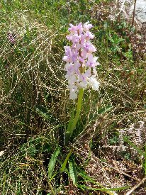 The Dense-flowered Orchid, I am told can be found on a bluff to the right of the road where it rises and bends. I see a low mound and we head for that expecting a long haul job. Both Leif Bersweden in The Orchid Hunter and Jon Dunn in Orchid Summer seem to have spent ages searching for this species. Miraculously I spot one within a minute, followed by more. I can see why they had problems though. It is small, growing in grass as tall as it, and it rivals the Small White Orchid for being undramatic in a small and white manner. No way does it leap out at you saying here I am. Across the road (above the bit where the Marsh orchid was found) there are more, and we see well over 25 in total, though some are going over now, This species likes the high points, for working down the slopes they peter out. The irony is that this is a Must See species of The Burren, but few will be remotely impressed by it. You cannot even see the flowers properly! It is one of the Mediterranean species said to have been trapped here after the last Ice Age and it has been on my list in a couple of Mediterranean localities. I now see while I have failed in those warmer climes.