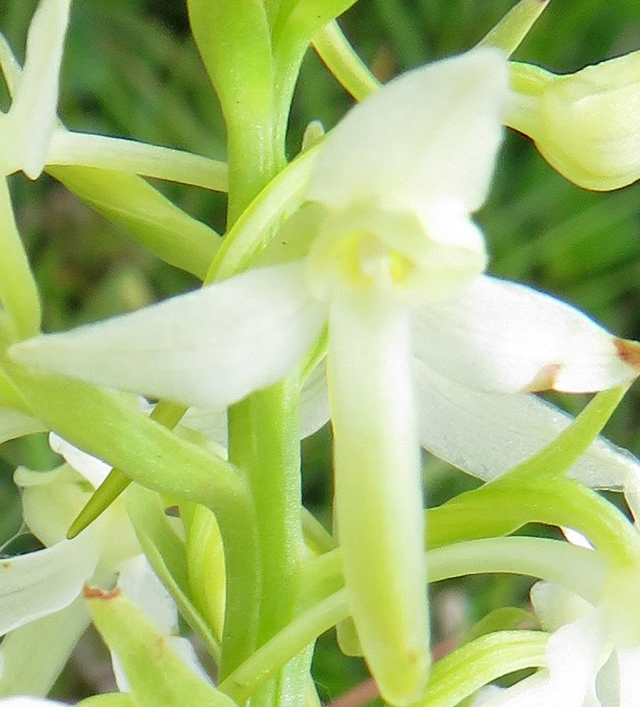 We have been regular visitors here until 2020. Five whole years have gone by. Perhaps I have been put off off by the steep climb up here. Anyway, things have changed a bit. The was a nice group of Greater Butterfly Orchids under a hedge; sheltered so a flash was need for a photo. These have disappeared. However, the are a good number of fine examples dotted roadside and on the open grass in places we have not been before. We have seen this before. Where we first saw Greater Butterflies they were gone 2 or 3 years later. They come and go. When I first came here I reported both Greater and Lesser Butterfly Orchids. On subsequent visits the latter were not seen, and I gave up looking. However I have found one contender for Lesser Butterfly Orchid this time. I have trouble spotting these in the field and rely on examining photos later. But try and get a good full frontal picture of a single flower!