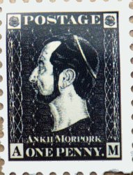 Issue 3 of the Stanley Howler Stamp Journal had another Penny Patrician variety as the free gift, and therefore limited to about 500 copies. With corner cartouches showing cabbages, and A and M. The Penny Civic had H and V, and A and M. The regular stamp had cabbages, and D and W. Got that? Simple isn`t it? The Civic Cabbage is said to be based on an old design, but to be frank, the only difference I can ascertain is those corner letters and motifs. I remember comments that Vetinari`s nose was different, but to me it is the same as the regular Penny Patricians. I have overlaid a Cabbage Civic and a identically sized Wincanton perforated stamp, and slowly faded the top one out, which should highlight any differences. Nothing leaps out at me, that cannot be explained by scanning and resizing the images.