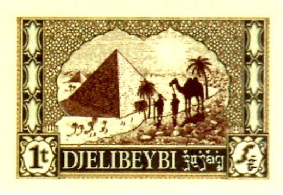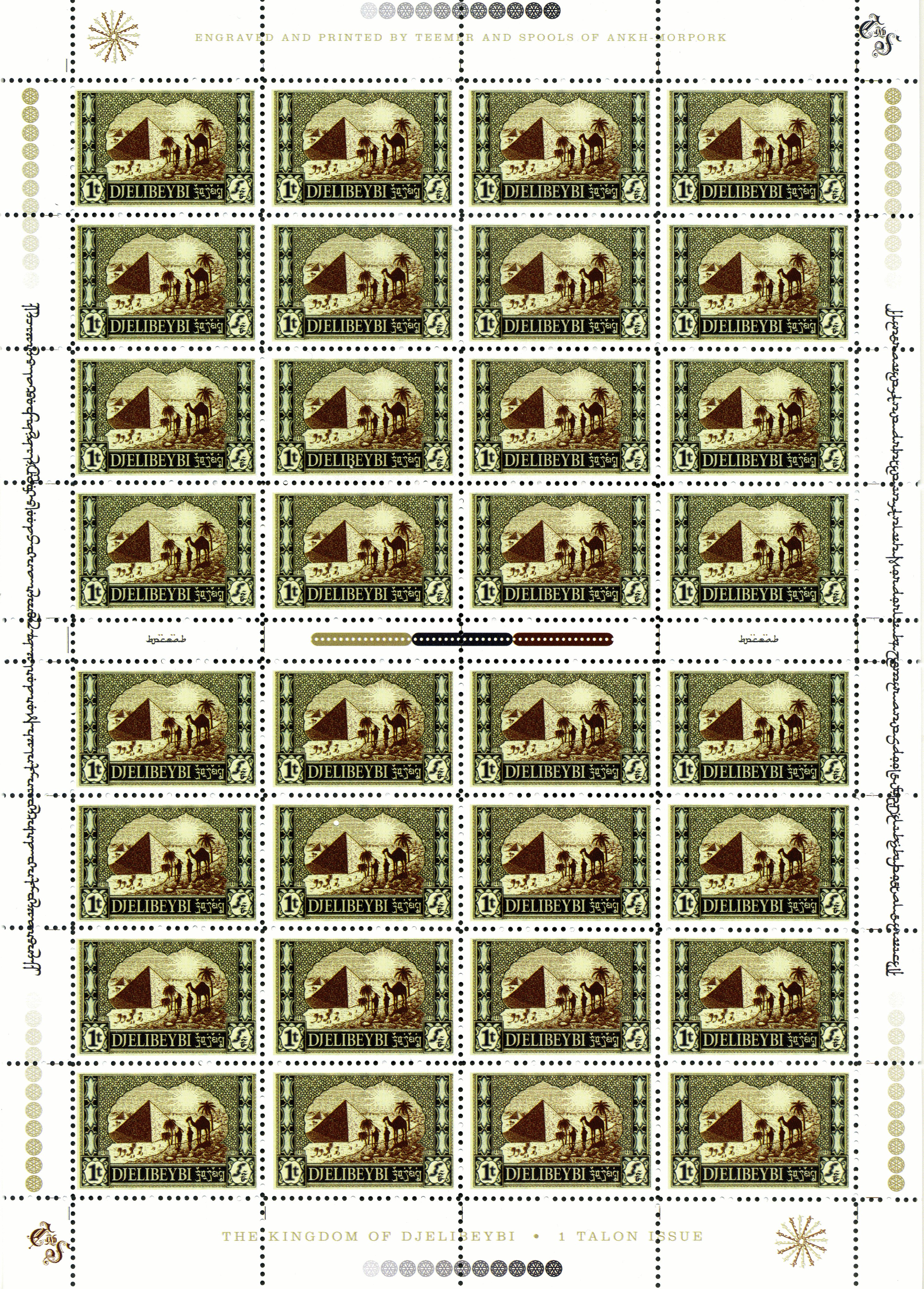 Another stamp that was originally intended as a generic issue was the Djelibeybi 1 Talon. An test print sheet shows the Tsort town artwork housed in the same framework as the Djelibebi stamp. For reasons discussed on the Tsort page this shared design may have persisted well after the ideas for an Offler shared design were abandoned. It is contemporary with a version of the Djelibeybi stamp. The stamps are unlikely to have been considered for release in this shade of brown.