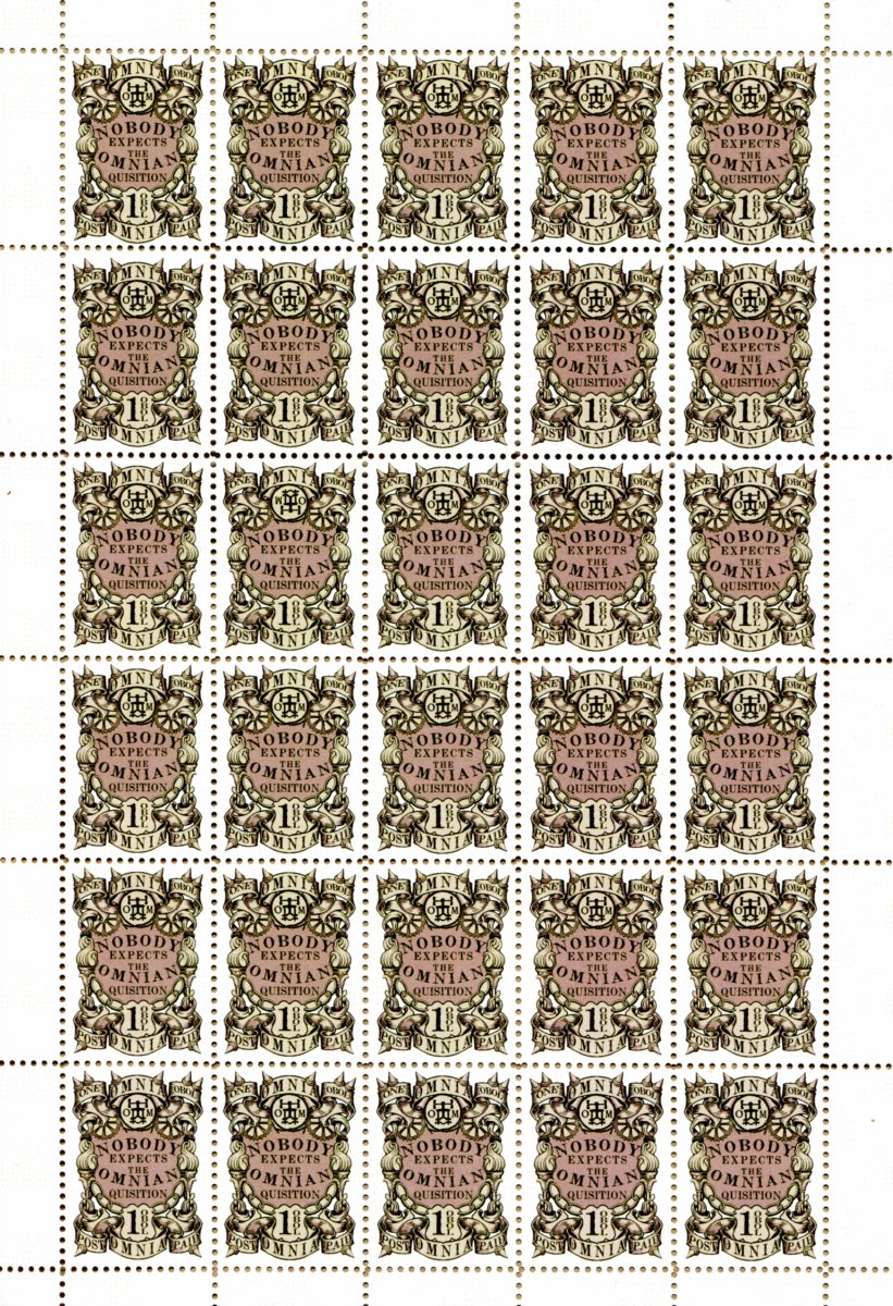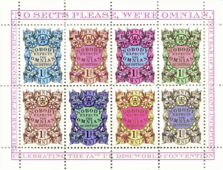 A second Omnian stamp issue paid tribute to the Quisition with a design reflecting the various instruments of torture they used. I do have a problem with this. The Quisition would have folded many years previous when Brutha because the head of the church and revealed as the 7+1th prophet. This was from a period modern Omnians would prefer to forget. The stamps were printed in sheets of 30 with a single sport showing a finger press inverted. The stamps were available only for a limited period. A prize item for a lucky few LBE buyers was an extraordinary multicoloured mini-sheet of eight stamps. These can also be found on a very few covers.