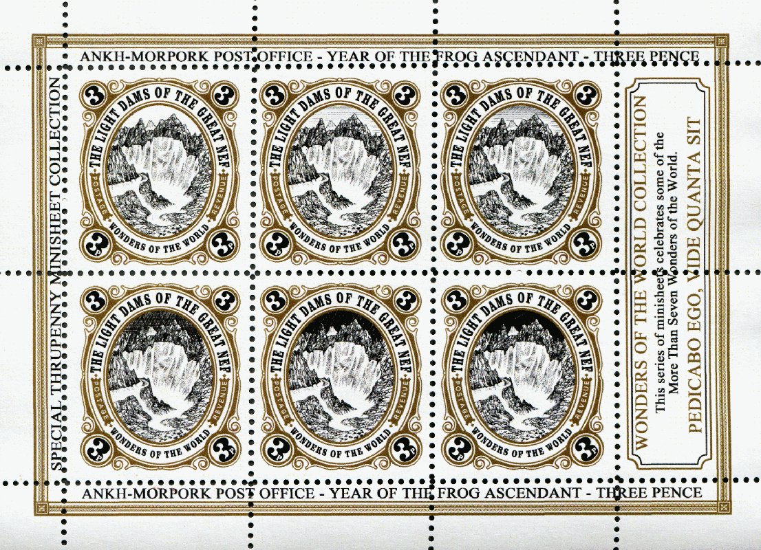 A pair of the Wonders of Discworld mini-sheet collection feature wonders associated with Klatch, so this seems to be the best place for them in the absence of a dedicated minisheet page. The Colossus of Tactiturn and The Light Wells are both in the Klatchian desert. Read about them on the accompanying explanatory inserts.