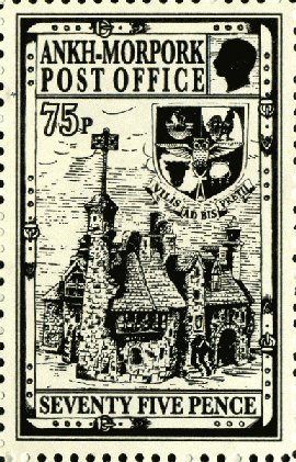 Places of Interest A set of three stamps promoting tourism, the reason behind the guilds original formation, and issued in a two stamp and single stamp release all within the Year of the Three Roses. The Mended Drum stamp was chosen to attract the more adventurous tourists, while the Dysk was aimed at those with a more cultural bent. Almost uniquely these stamp were letterpress printed. The artwork is by Karen Dupe (again her only DW stamp appearance) and were based on original Paul Kidby drawings. The is no textual indication that these are Merchants Guild stamps, however the Guild Arms is present and obvious. Each stamp had one sport on the sheet, however because of the artwork and how it printed collectors were spotting minute differences from stamp to stamp. Again a new printer won the contract for these stamps. The sheet selvedge announces that they were engraved and printer by Ronald Goatberger, Publisher, for the Guild of Merchants.