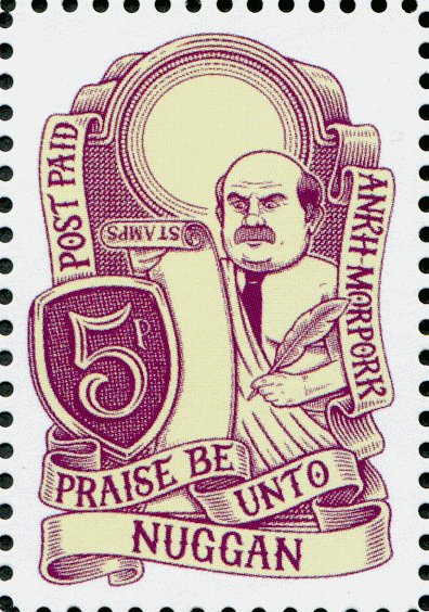 During the Year of the Incontrovertible Skunk The Council of Churches, Temples, Sacred Groves and Big Ominous Rocks sponsored a set of three stamps featuring Gods who had already appeared on stamps - Offler, Anoia and Blind Io. All quite naturally had sports on the sheets. Offler has super-sized his sausage, Anoia has swaoed he spatula for a spoon and Blind Io has second sight.